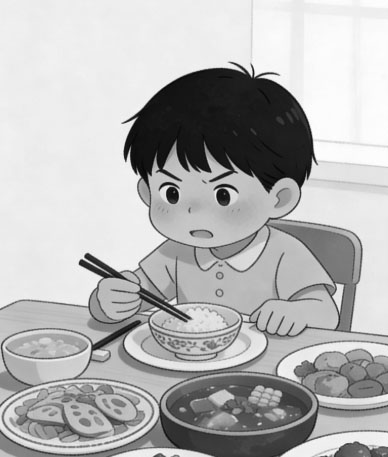 4. 情志影响:吃饭时被训斥、哭闹,或环境嘈杂,导致“肝气郁结”“气裹食”,影响脾胃运化,表现为拒食、吃饭不专心。